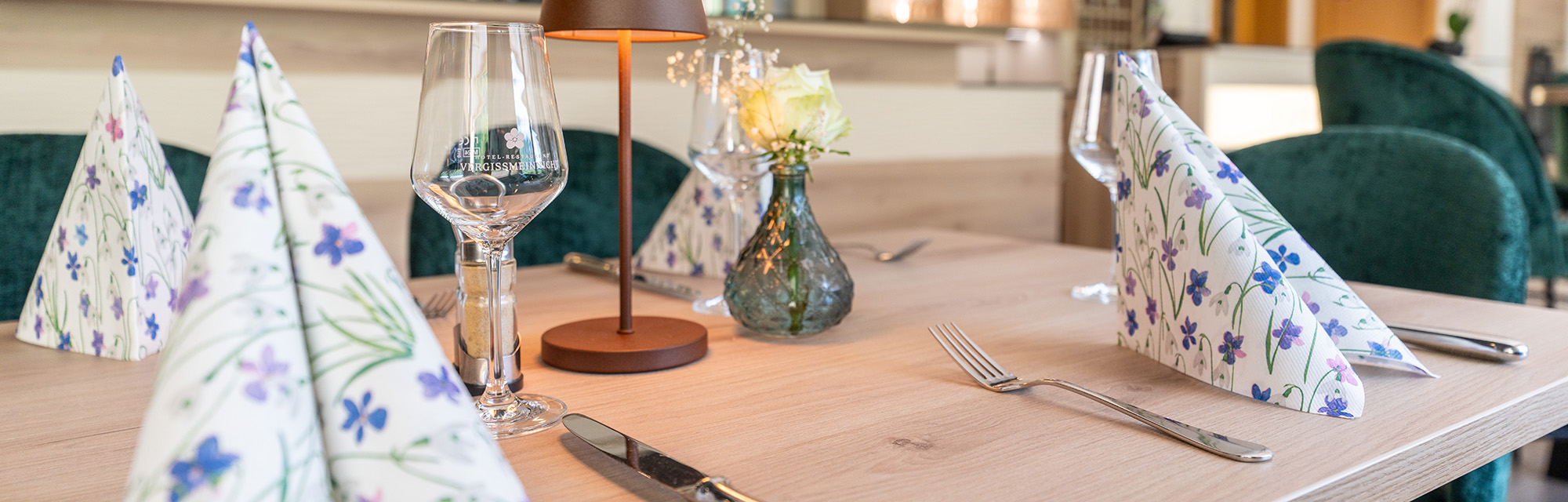 Darüber hinaus betreibt das Hotel "Vergissmeinnicht" noch ein Restaurant/Gaststube mit individuell unterteilbaren Räumen von 40, 50 und 60 Personen Sitzplatzkapazität und eine Sonnenterrasse mit Moselblick auf der 65 Personen Platz finden. Unsere Küche unter Leitung der Chefin kocht für Sie Speisen der gut-bürgerlichen und regionalen Küche.